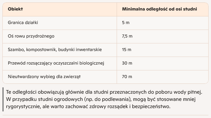 Te odległości obowiązują głównie dla studni przeznaczonych do poboru wody pitnej. W przypadku studni ogrodowych (np. do podlewania), mogą być stosowane mniej rygorystycznie, ale warto zachować zdrowy rozsądek i bezpieczeństwo.