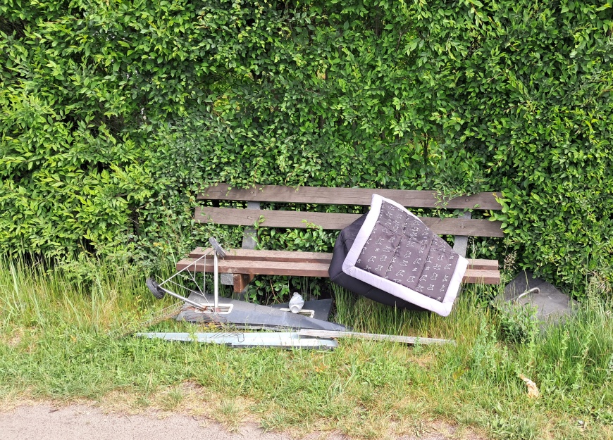 Wczoraj zauważyłam w alejce Spacerowej, że ktoś wyrzucił odpady na ławkę. Przysiadają na niej czasami starsze osoby zmęczone marszem do swojej działki. Wśród śmieci były jakieś metalowe przedmioty, połamane kółka od wózka puszki po piwie oraz coś wyglądające na kołdrę. Wszystko wywalone na ławeczkę zamiast do kontenera. Powstaje więc pytanie: komu żeś to chamie zostawił?